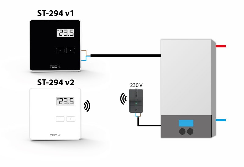 Комнатный термостат TECH STEROWNIKI ST-294 V1 поддерживает заданную темперауру в помещении управляя источником тепла.