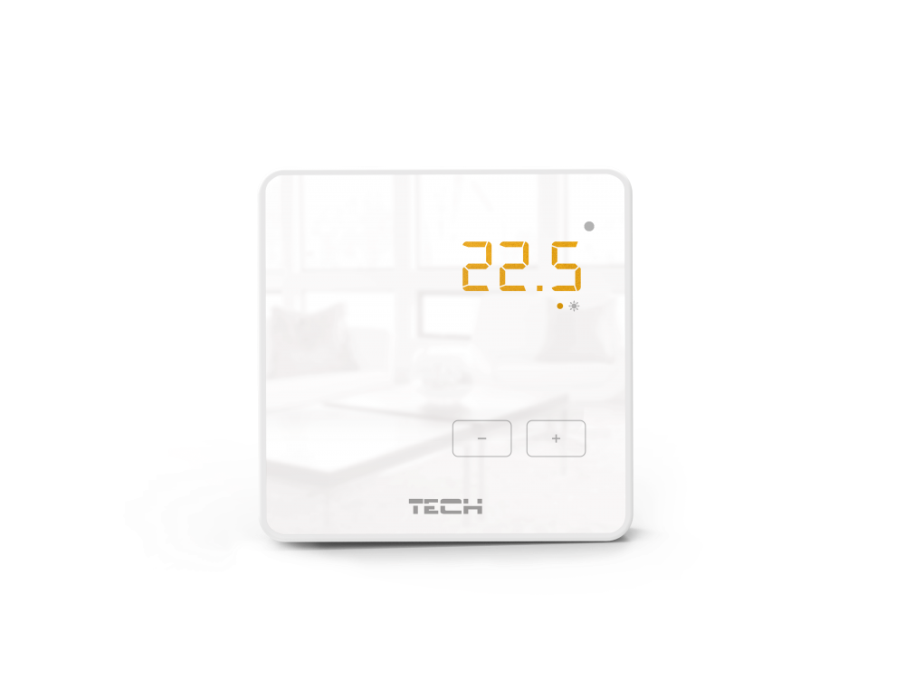 Комнатный термостат TECH STEROWNIKI ST-R-9Z с возможностью подключения датчика температуры пола поддерживает заданную темперауру в помещении передавая данные на контроллер TECH ST-L-9R.