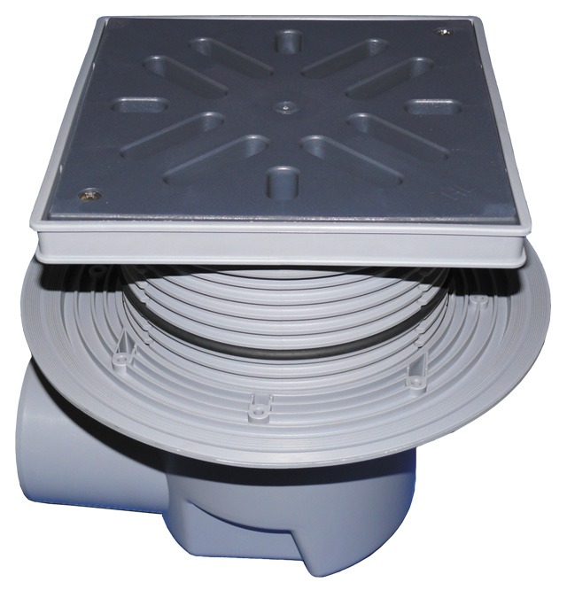 Дворовый трап серии Perfekt DN110 горизонтальный с обжимным фланцем, со снимаемыми насадными подрамниками из ПП 42 - 130 мм / 240 х 240 мм и решеткой из ПП 226 х 226 мм, с песколовкой и водяным затвором.