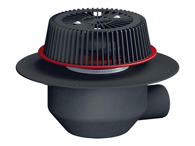 Воронка для аварийного водостока с горизонтальным выпуском DN110 с корпусом из ПП, с возможностью регулировки толщины слоя воды от 28 до 68 мм.