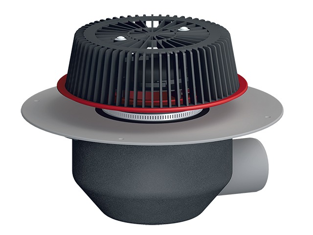 Воронка для аварийного водостока с горизонтальным выпуском DN75 с эл. обогревом, с корпусом из ПВХ, с возможностью регулировки толщины слоя воды от 28 до 68 мм.