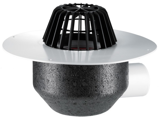Кровельная воронка DN75, горизонтальный выпуск, с теплоизоляцией, с ПВХ-фланцем для приварки ПВХ-мембраны, с листвоуловителем d 180 мм. Строительная заглушка в комплекте.