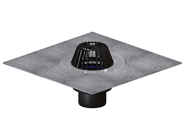 Воронка для плоских кровель DN75 вертикальный выпуск с теплоизоляцией, с приваренным битумным полотном d 500 мм, в качестве идеального соединения к битумным кровельным уплотнениям, с листвоуловителем d 180 мм. Строительная защита во время монтажа в комплекте.