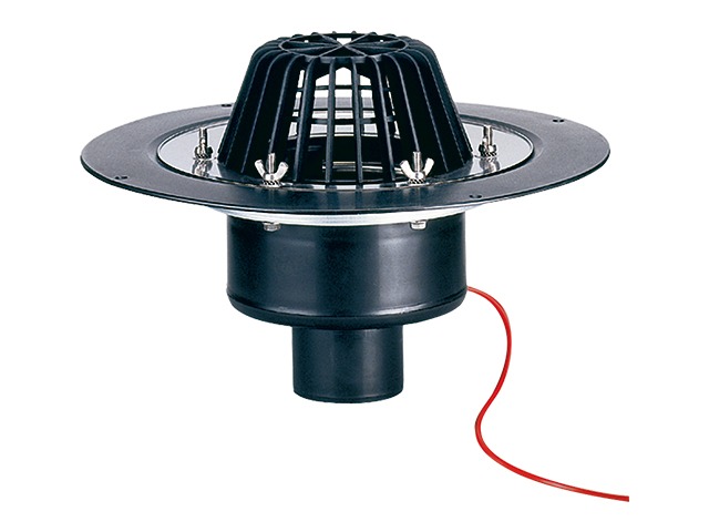 Воронка для плоских кровель DN75 вертикальный выпуск с электроподогревом от сети напряжением 230В, мощностью 10-30Вт, с обжимным фланцем и зажимным из нержавеющей стали для прикрепления уплотнительных пленок, с листвоуловителем d 180 мм. Строительная защита во время монтажа в комплекте.