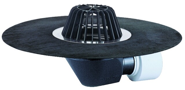 Воронка для плоских кровель DN75/110 горизонтальный с теплоизоляцией, с приваренным битумным полотном d 500 мм, в качестве идеального соединения к битумным кровельным уплотнениям, с листвоуловителем d 180 мм. Строительная защита во время монтажа в комплекте.