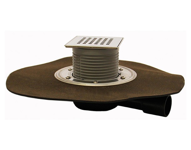 Трап с полимербитумным полотном, дизайн-решеткой "Квадро" из нержавеющей стали 115*115 мм в металлическом подрамнике 121*121 мм, с "сухим" сифоном "Primus", с пропускной способностью - 0,5 л/с, с горизонтальным выпуском DN 40/50.