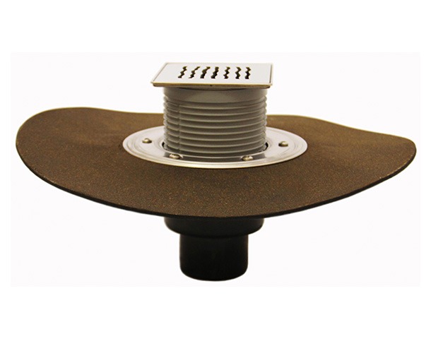 Трап с полимербитумным полотном, дизайн-решеткой "Ориноко" из нержавеющей стали 115*115 мм в металлическом подрамнике 121*121 мм, с "сухим" сифоном "Primus", с пропускной способностью - 0,5 л/с, с вертикальным выпуском DN 50/75/110.