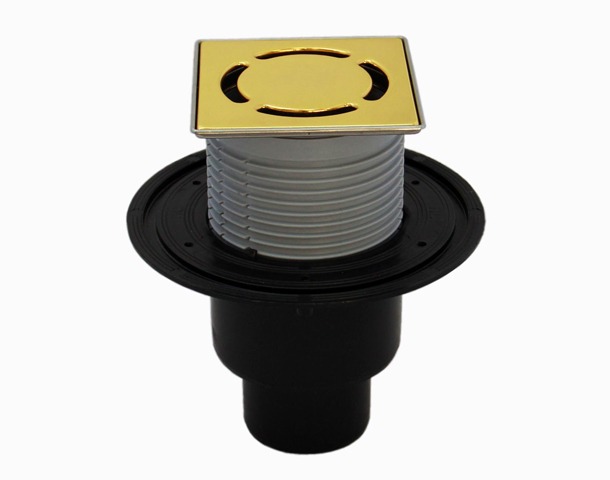 Трап с позолоченной решеткой из нержавеющей стали 115*115 мм в металлическом подрамнике 121*121 мм, с "сухим" сифоном "Primus", с пропускной способностью - 0,5 л/с, с вертикальным выпуском DN 50/75/110."
