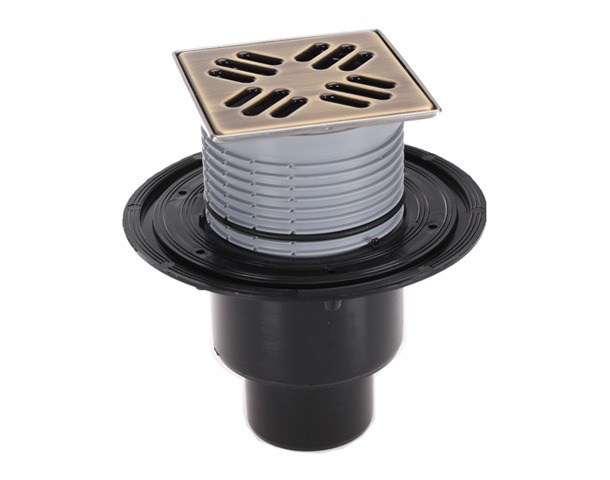 Трап с решеткой из нержавеющей стали 115*115 мм покрытой "светлой бронзой" в металлическом подрамнике 121*121 мм, с "сухим" сифоном "Primus", с пропускной способностью - 0,5 л/с, с вертикальным выпуском DN 50/75/110.