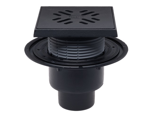 Трап для внутренних помещений DN50/75/110 вертикальный с обжимным фланцем, запахозапирающим устройством, со снимаемой насадкой из ПП 34 - 73 мм, чугунными подрамниками 150 х 150 мм и решеткой 137 х 137 мм. Строительная защита во время монтажа в комплекте.