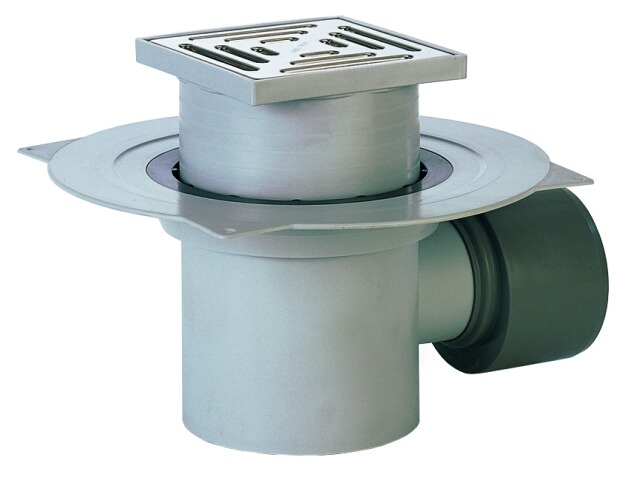 Трап для внутренних помещений DN75/110 горизонтальный с обжимным фланцем, со снимаемыми насадными подрамниками 20 - 70 мм / 147 х 147 мм, решеткой из нержавеющей стали 138 х 138 мм, песколовкой, запахозапирающим вкладышем, прочисткой. Высота запахозапирающего устройства: 60мм. Строительная защита во время монтажа в комплекте.