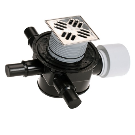 Трап для внутренних помещений с механической задвижкой для предотвращения затопления помещения при возникновении подпора в наружной сети, с решеткой 115*115 мм в подрамнике 123*123 мм, высотой гидрозатвора 50 мм, с горизонтальными нормально заглушенными тремя входами и горизонтальным выпуском.