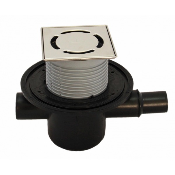 Трап для внутренних помещений с обратным клапаном для предотвращения затопления помещения через решётку трапа, с решеткой 115*115 мм в подрамнике 123*123 мм, высотой гидрозатвора 50мм, с одним дополнительным входом и горизонтальным выпуском, диаметр 50мм, пропускная способность 0,5л/с, допустимая нагрузка 300кг.