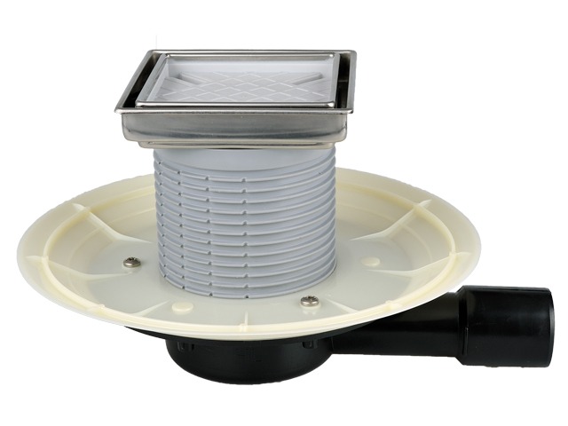 Трап для балконов и террас, с горизонтальным выпуском DN40/50, с механическим незамерзающим запахозапирающим клапаном, с надставным элементом с подрамником из нержавеющей стали 132х132 мм и вкладышем 112х112 мм для вклеивания керамической плитки, монтажная высота надставного элемента 10-80 мм. В комплекте: монтажная и строительная заглушка.