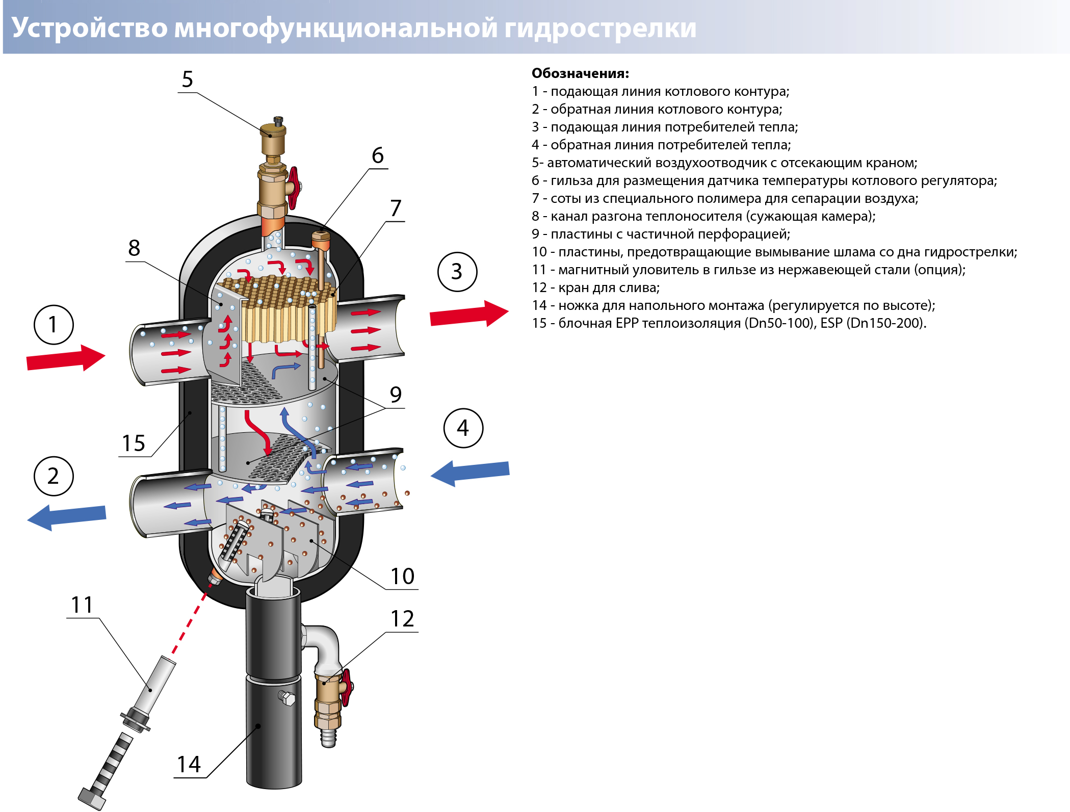 Гидравлическая стрелка предназначена для гидравлического разделения источников и потребителей тепла. Обеспечивае тэкономичность использования энергоносителей и ресурса оборудования. Все трубопроводные подключения заканчиваются патрубками Victaulic.