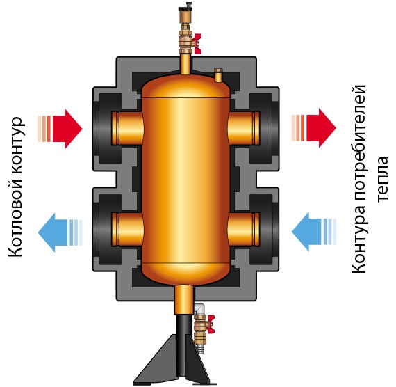 Применение гидравлических разделителей (гидрострелок): задача гидравлического разделения котлового и отопительного контуров заключается в том, что бы обеспечить постоянный расход теплоносителя в котловом контуре. То есть, при установке гидрострелки изменения расхода теплоносителя каждого отдельного отопительного контура по отдельности и соответственно всех вместе никак не влияет на котловой контур. А так как любая отопительная система всегда является динамичной с постоянно изменяемой величиной расхода, который зависит от тепловой нагрузки потребителей, то использование гидрострелки гарантировано исключает влияние насосов вторичного контура на котел.
