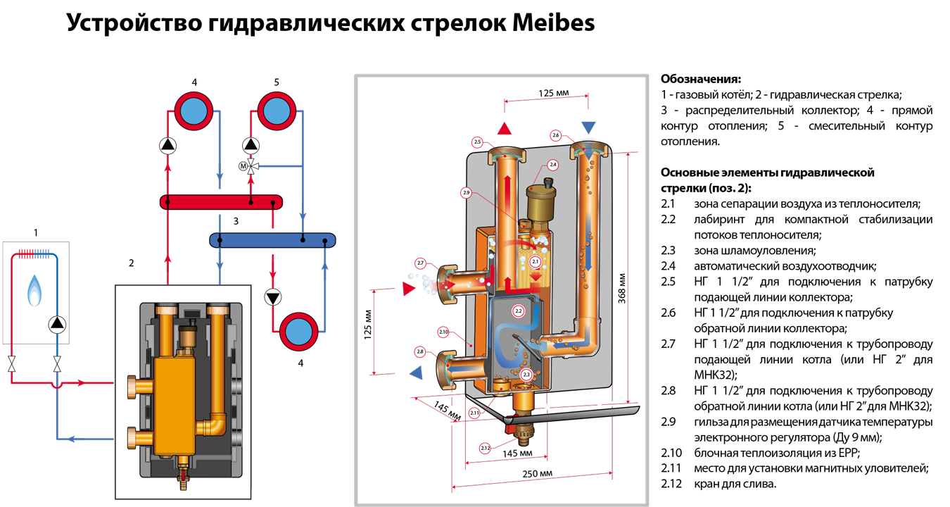 Помимо своей основной задачи гидравлические стрелки Meibes выполняют еще функции удаления воздуха и шлама из системы.