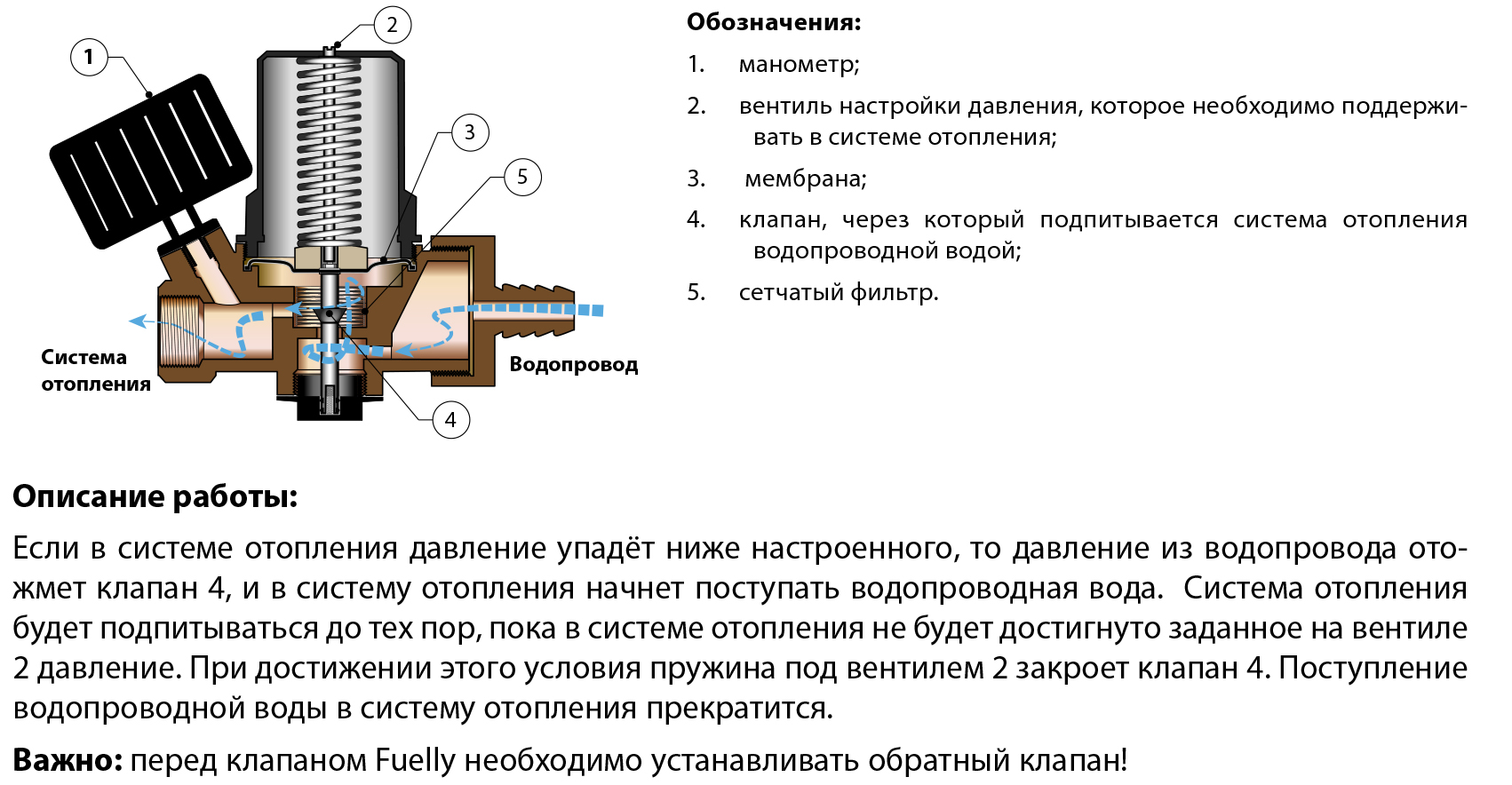 Область применения: автоматическое заполнение и поддержание давления в системе отопления за счёт давления в водопроводной сети (PN10).