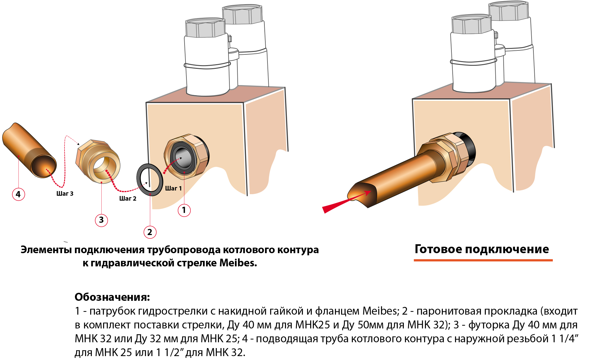 Футорки предназначены для удобного подключения труб со стороны котла к гидрострелке. Они обеспечивают надежное прижимание паранитовой прокладки к фирменному фланцу Meibes (в месте резьбового соединения на гидравлической стрелке). Это удобство обеспечивается благодаря тому, что торец футорки, который вкручивается в накидную гайку гидрострелки, имеет большую толщину (т.е. прокладка надежно прижимается по всей поверхности ответного фланца Meibes).