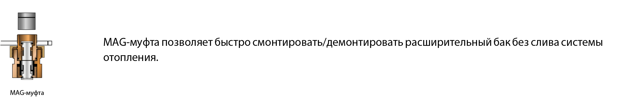 В комплект входит гибкий шланг Ду 20 мм (длиной 700 мм) в оцинкованной оплётке, угловой кронштейн, быстроразъёмная MAG-муфта с подключением расширительного бака - НГ 3/4’’ (позволяет быстро снять бак без его опороженения и слива системы отопления), комплект дюбелей.