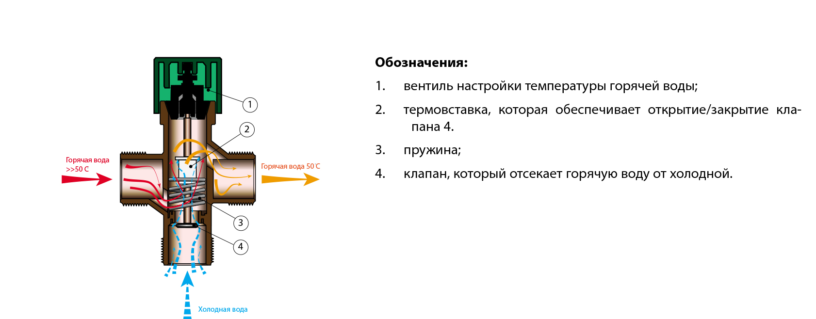 При превышении установленной максимальной температуры горячей воды, идущей к потребителю, смеситель будет подмешивать холодную воду в проходящую через него горячую воду.