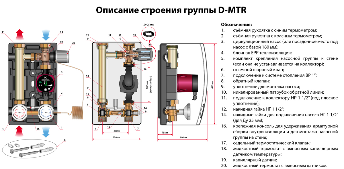 Насосные группы D-MTR с поддержанием постоянной температуры обратной линии серии Design Huch EnTEC предназначены для циркуляции теплоносителя и одновременно поддержания постоянной температуры обратной линии. Поддержание осуществляется c автоматическим добавлением теплоносителя из подающей линии, в случае падения температуры обратного потока. Управление осуществляется с помощью термостатического клапана.