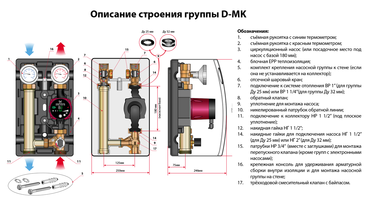Насосные группы D-MK доступны в двух вариантах: с правой и левой подачей. В данном типе насосных групп подающая и обратная линии не меняются.