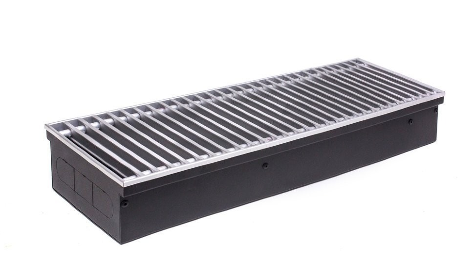 Встраиваемый в пол конвектор Kermi GmbH KVN шириной 180 мм, высотой 150 мм, длиной 1000 мм, короб конвектора изготовлен из оцинкованной стали и окрашен износостойким порошковым покрытием, медно-алюминиевый съемный теплообменник оснащен латунным коллектором с соединением «евроконус» G 3/4‘‘ и воздухоспускным клапаном. Тип KVN, теплопроизводительность 401 Вт, максимальное рабочее давление: 16 бар, испытательное 25 бар, рабочая температура: макс 130 °C. В стандартном исполнении конвекторы поставляются с продольной алюминиевой решеткой.