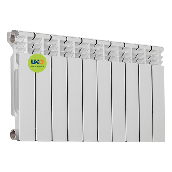 Внутренний слой биметаллических радиаторов UNO изготовлен их высоколегированной стали, что обеспечивает его работу при более высоком давлении и при любом уровне кислотности теплоносителя. Внешний слой изготовлен из высококачественного алюминиевого сплава, что гарантирует высокую теплоотдачу радиатора. Радиатор окрашен белой порошковой эмалью с последующим обжигом в печи. В заводской упаковке поставляются 10 секционные радиаторы.