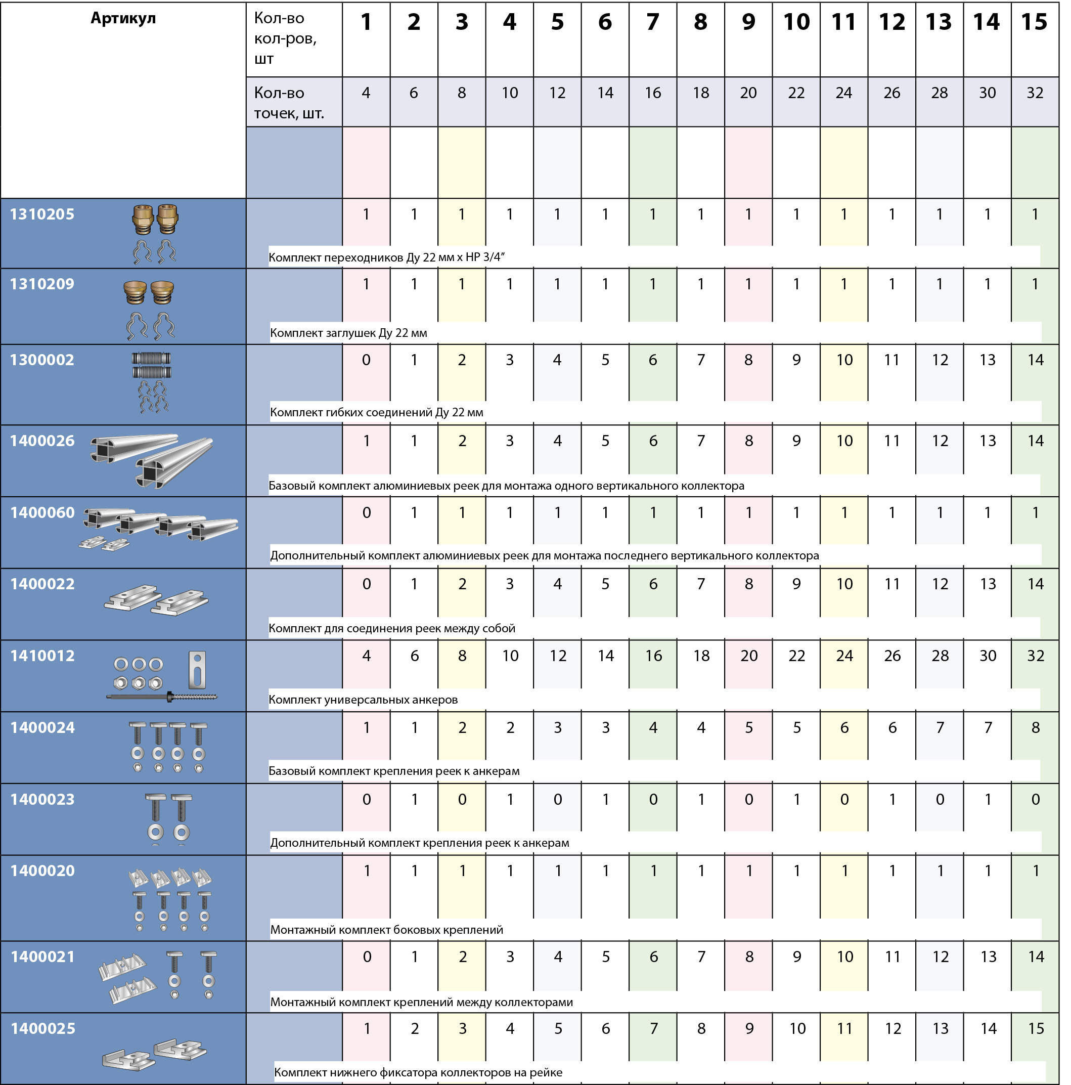 Таблица для подбора крепежа на разное количество коллекторов в одном ряду:
