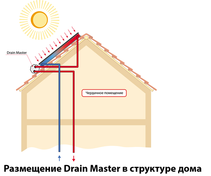 Размещается непосредственно на крыше (снаружи), снизу под смонтированными самосливнымисолнечными коллекторами.