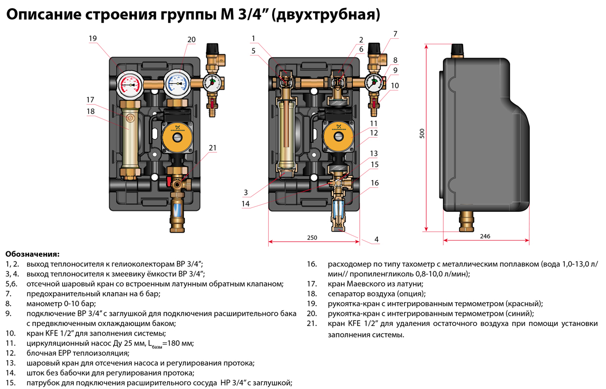 Также группа позволяет гидравлически отсекать насос от гелиоконтура, отсекать подающую линию, имеет подключение для расширительного сосуда, патрубки для заполнения и обезвоздушивания гелиоконтура и вторичного контура, индикации текущего давления теплоносителя, сброс излишнего давления, быстрого подключения расширительного бака.