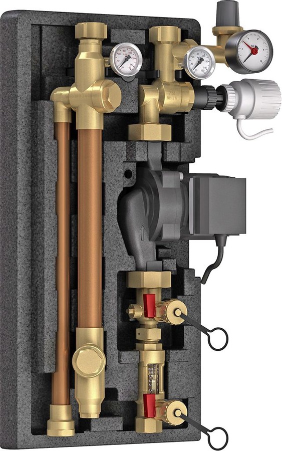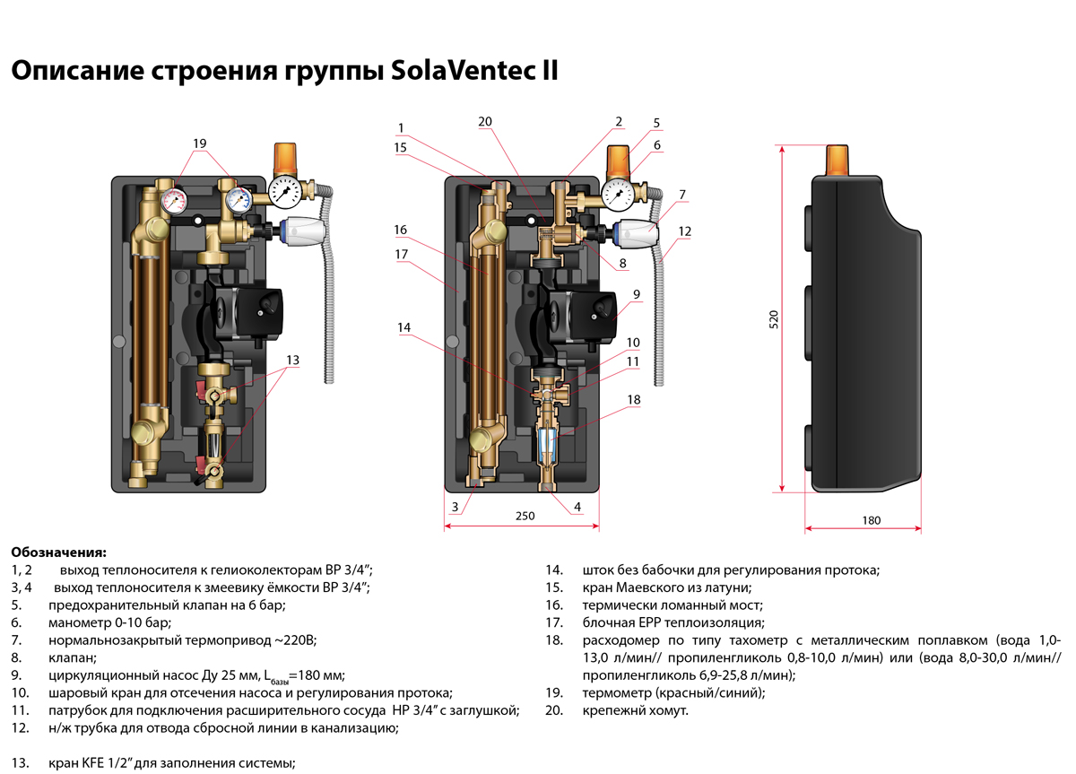 Также группа позволяет регулировать расход теплоносителя, гидравлически отсекать насос от гелиоконтура, имеет подключение для расширительного сосуда, патрубки для заполнения и обезвоздушивания гелиоконтура при помощи станции заполнения системы, индикации текущего давления теплоносителя, сброс излишнего давления.