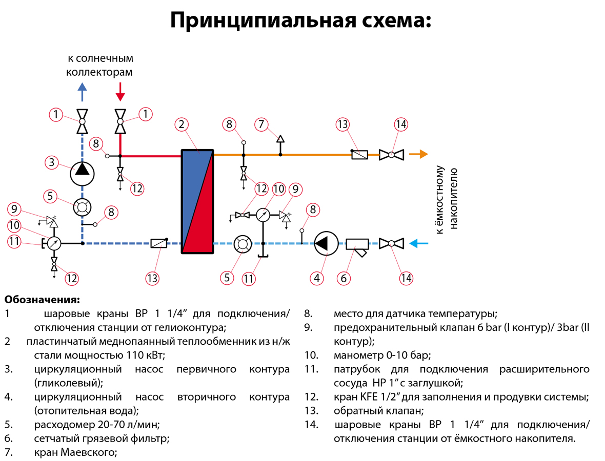 Каждый из контуров оснащен электронным циркуляционным насосом, приборами безопасности, расходомерами, отсечной арматурой. Трубные соединения внутри станции выполнены предизолированной гофротрубой из нержавеющей стали. Теплообменник теплоизолирован минеральной ватой и закрывается металлическим кожухом. Вся сборка собрана на алюминиевой раме.