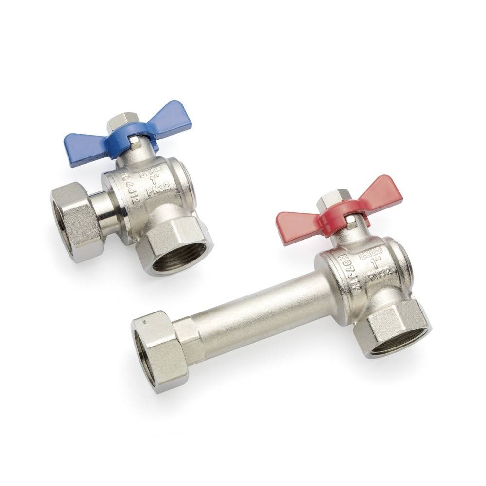 Состоит из двух угловых шаровых кранов: с красной и синей рукоятками. Оба крана имеют с одной стороны внутреннюю резьбу 1”, с другой – накидную гайку 1” с плоским уплотнением. Материал: никелированная латунь.